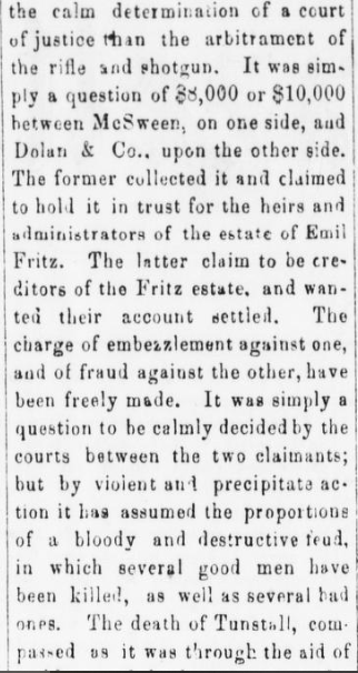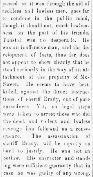 Tunstall’s ranch house is described as a 14-foot-square log cabin with sand-filled grain sacks piled in front. During the inventory of the property, Sheriff Brady’s posse discovered 360 head of cattle, two shovels, and an anvil.